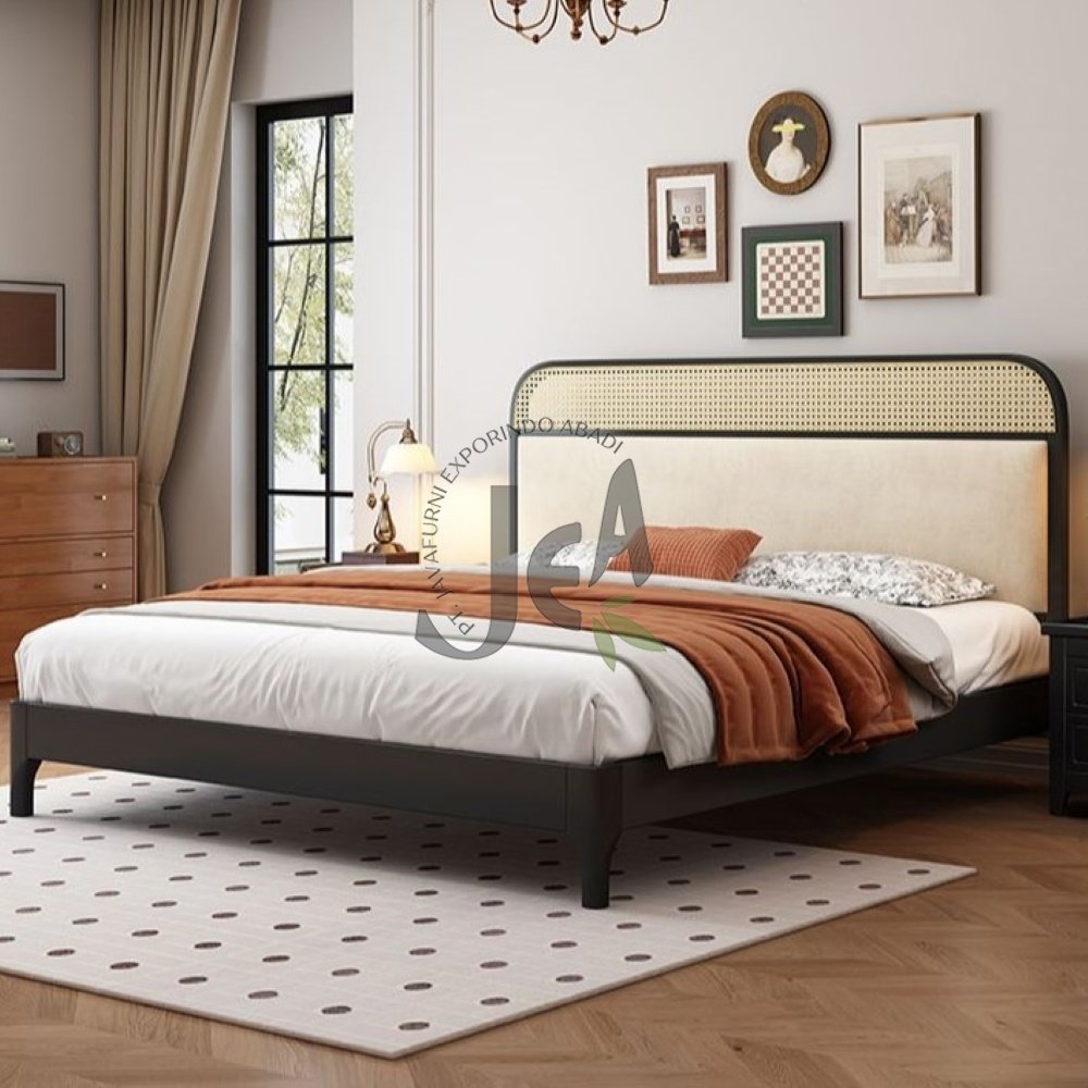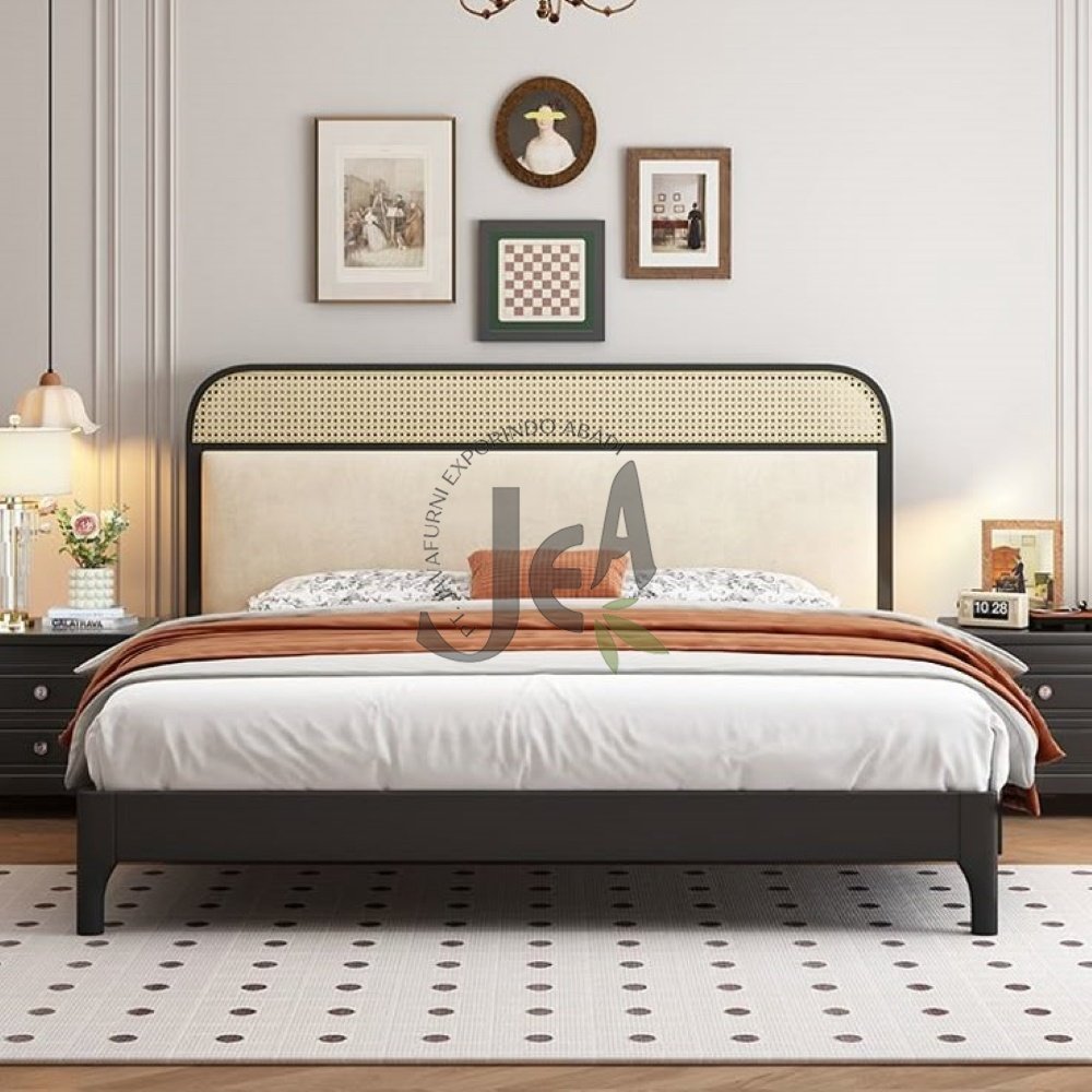 Gaya desain minimalis dipadukan apik dengan sentuhan alami yang memikat. Aksen anyaman rotan pada headboard memberikan dimensi tekstur unik, kontras elegan dengan cushion vynil off white yang lembut dan nyaman.