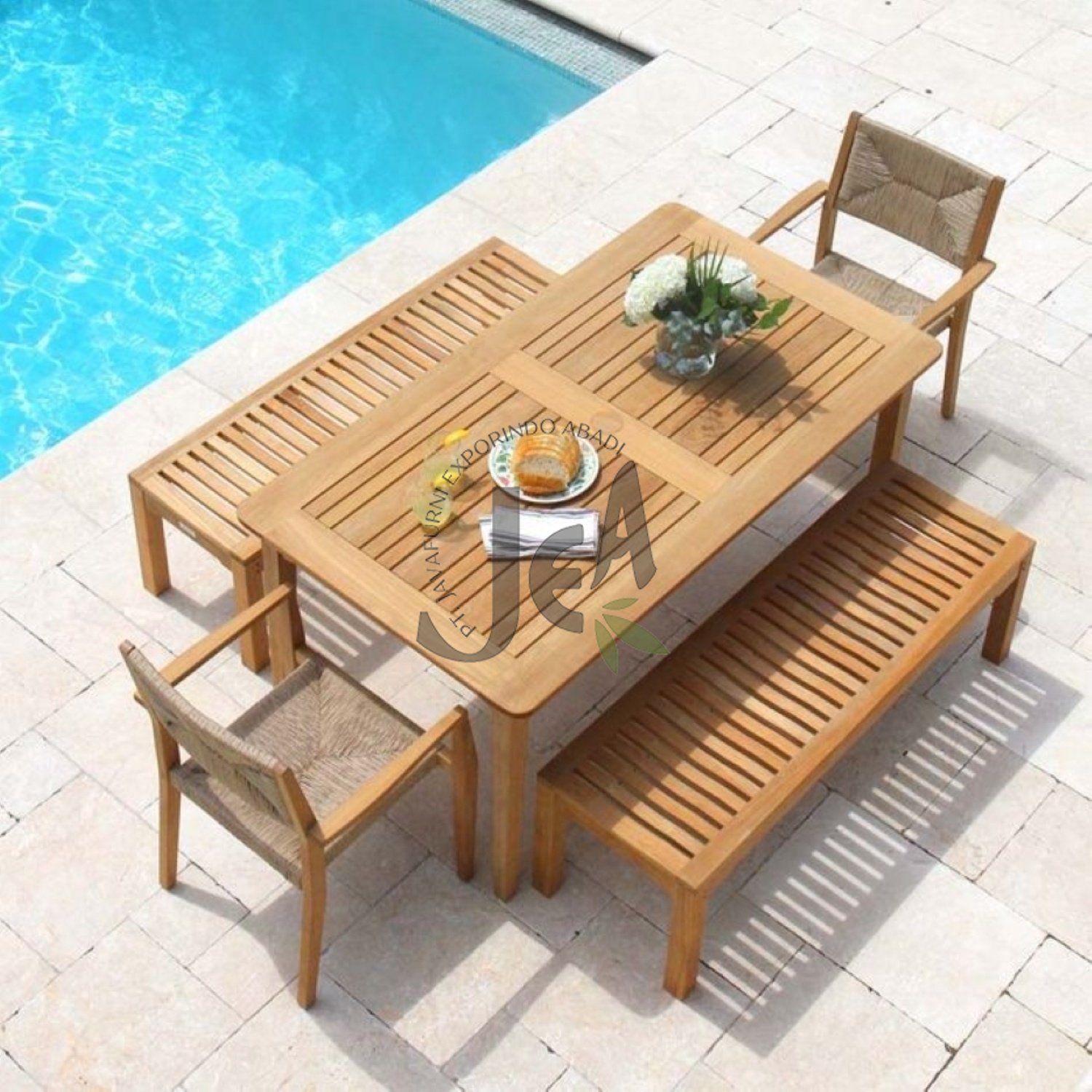 Komposisi set ini sangat fungsional, meliputi sebuah meja makan luas, dua bangku panjang yang lapang, serta dua kursi berlengan yang ergonomis. Kombinasi ini menawarkan fleksibilitas dan kenyamanan maksimal, memastikan setiap anggota keluarga atau tamu dapat menikmati waktu bersantap dengan leluasa.