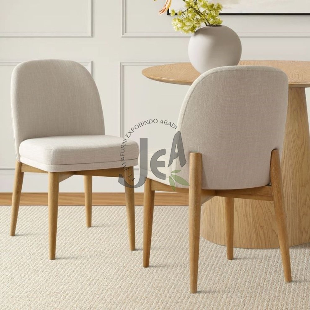 Bagian dudukan dilapisi dengan jok berwarna cream lembut, menambah sentuhan kenyamanan dan kontras yang anggun dengan rangka kayu. Kombinasi warna natural dan cream ini menciptakan harmoni visual yang cocok untuk berbagai gaya desain interior, dari modern minimalis hingga klasik.