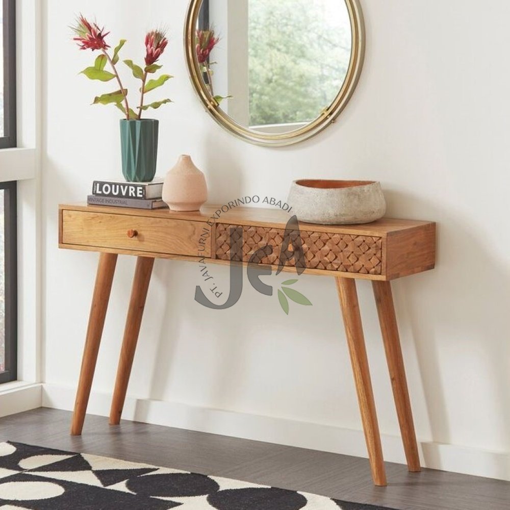 Desain Scandinavian terbaru pada meja konsol ini menampilkan garis bersih dan fungsionalitas yang harmonis. Finishing natural color memperkuat karakter alami serat kayu, menjadikannya focal point menarik di berbagai penataan interior.
