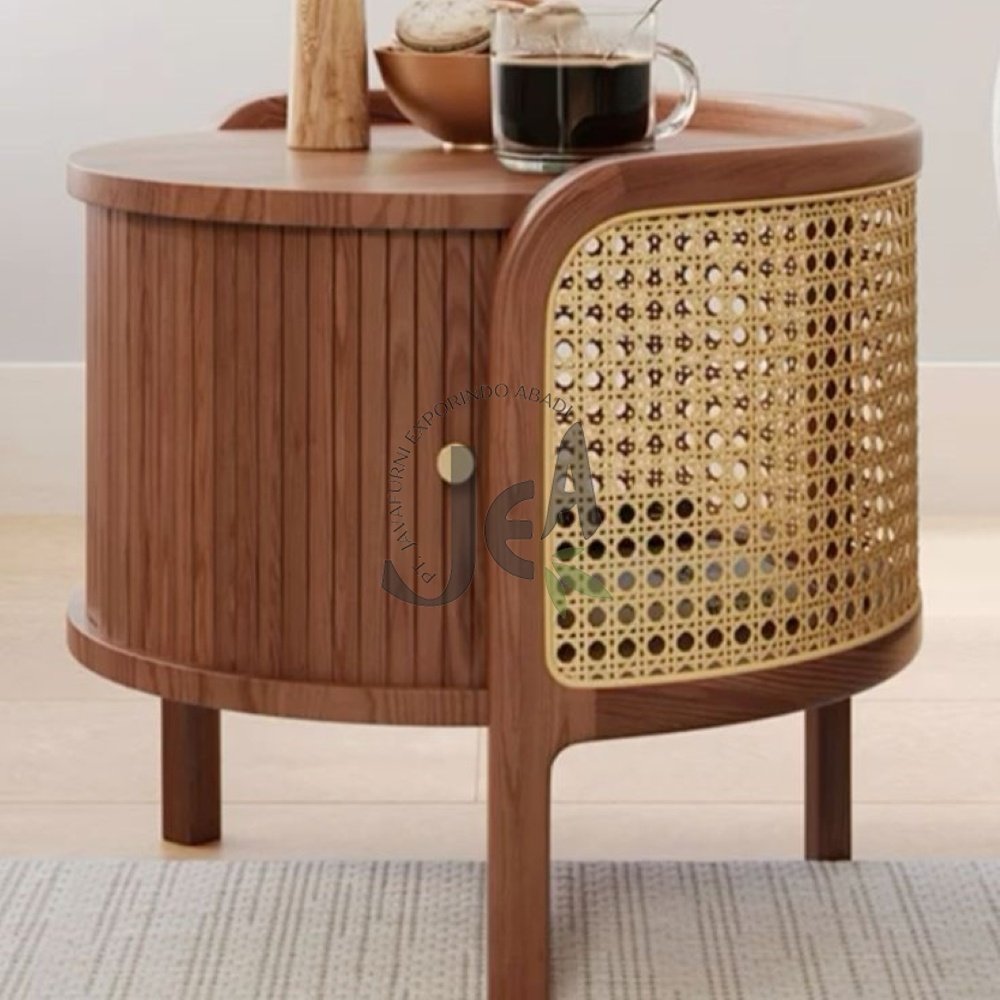 Fitur pintu sliding memutar menjadi daya tarik unik, memberikan akses mudah sekaligus menjaga barang-barang tetap rapi di dalamnya. Dengan ukuran diameter 52 cm dan tinggi 55 cm, Moritz Side Table ideal sebagai meja samping atau pelengkap dekorasi di sisi sofa Anda.