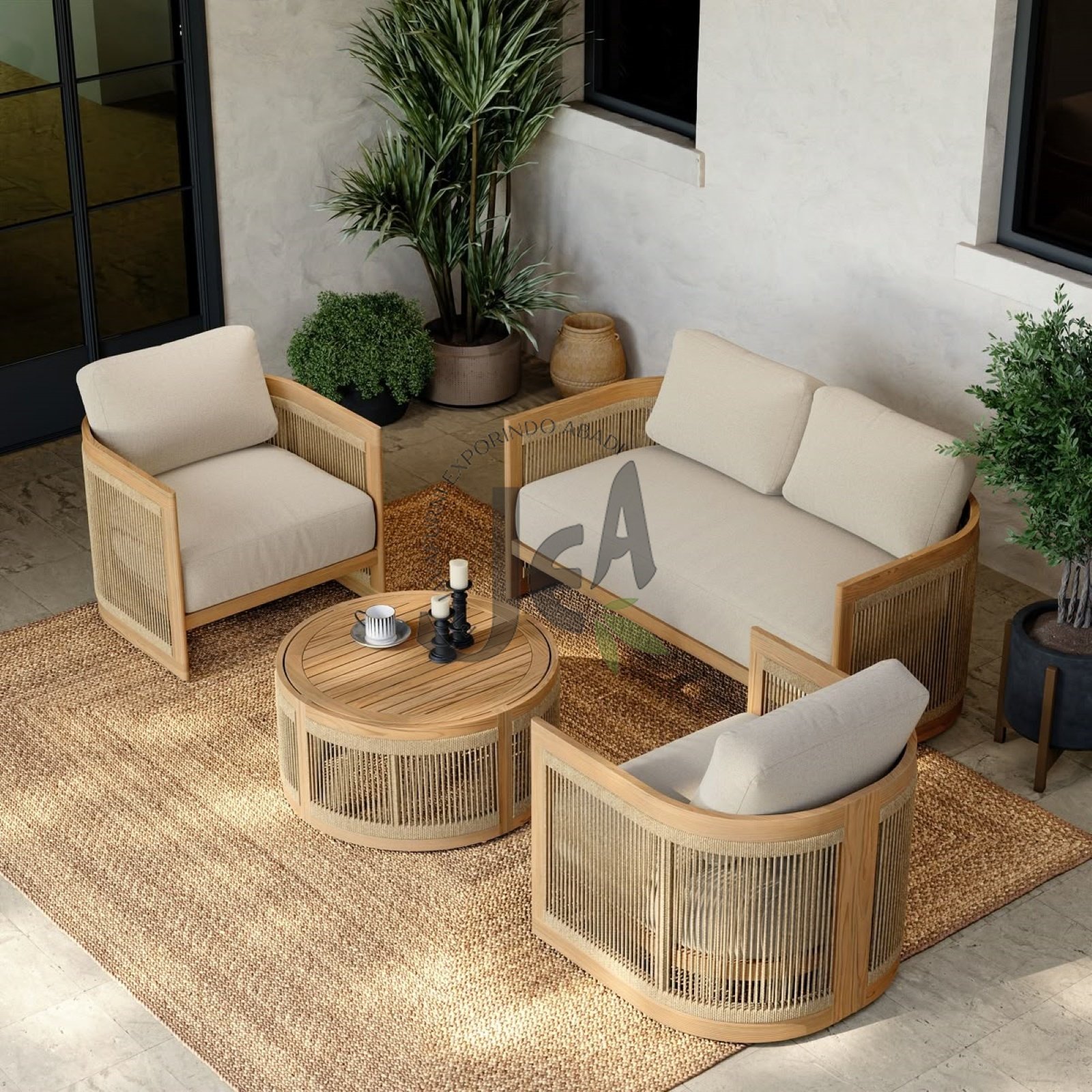 Kualitas material premium menjadi pondasi utama keindahan dan kekuatan Set Tamu Penama ini. Anda akan menemukan kombinasi kayu jati super pilihan, terkenal akan daya tahannya, dipadukan dengan anyaman tali atau rope kualitas premium yang menambah sentuhan unik serta kenyamanan saat digunakan.