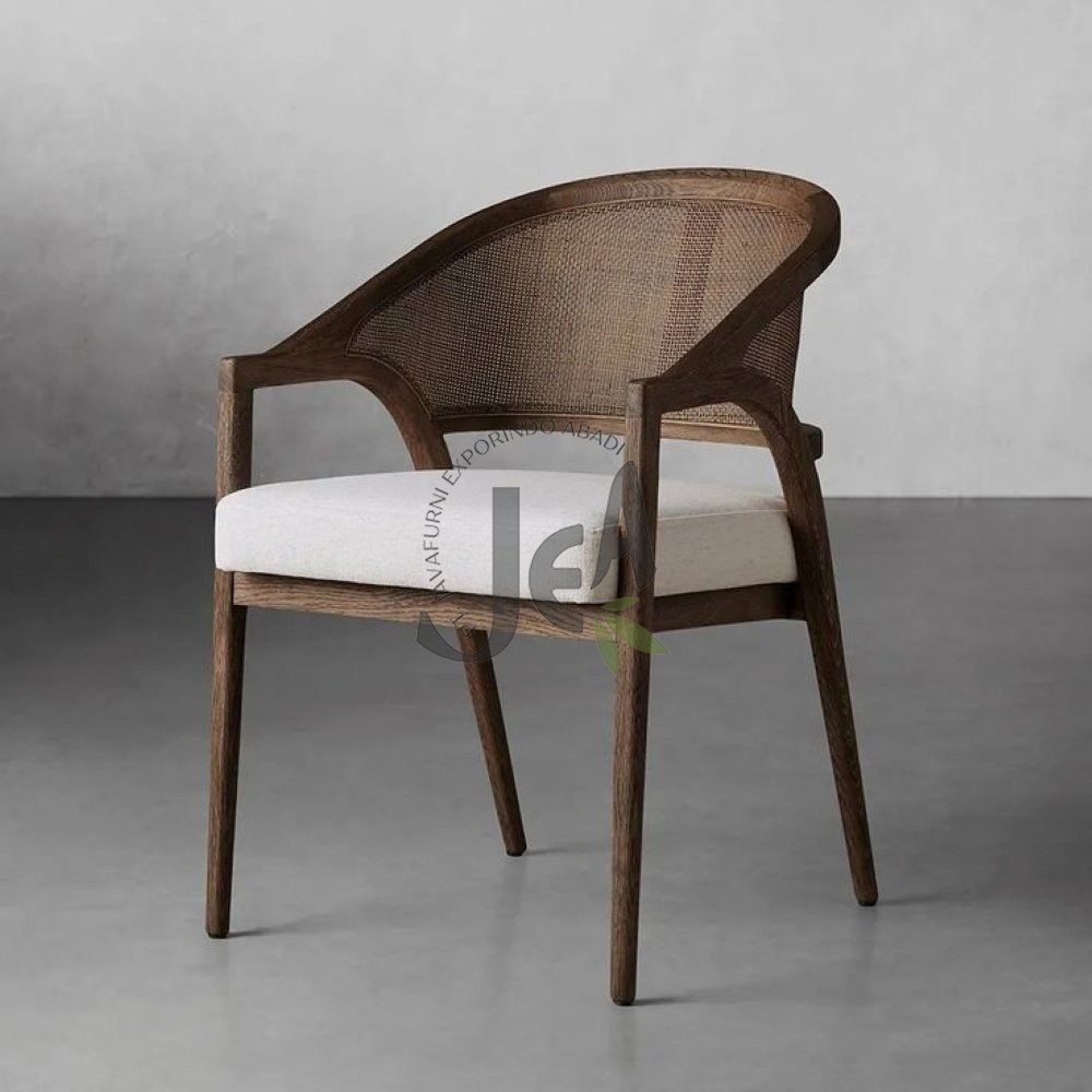 Setiap detail Taffana Armchair dirancang untuk kenyamanan dan gaya. Desain kursi ini dilengkapi dengan lengan, memberikan dukungan ekstra dan kenyamanan optimal saat bersantap atau sekadar bersantai. Dudukan yang empuk dilapisi dengan jok berwarna off-white, menciptakan kontras visual yang menarik dengan rangka kayu cokelat gelap, sekaligus menawarkan permukaan duduk yang nyaman dan lembut.