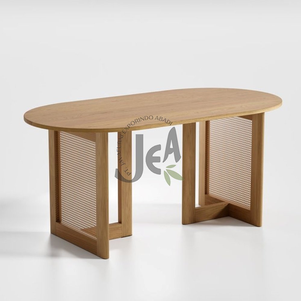 Desain inovatif meja makan Tisso memukau dengan bentuk ovalnya yang lembut, memberikan sentuhan estetika yang berbeda dari meja makan pada umumnya. Kekhasan lain terletak pada kaki penyangga yang unik, memadukan soliditas kayu jati dengan sentuhan kombinasi rotan, menambahkan dimensi tekstur dan karakter yang elegan.